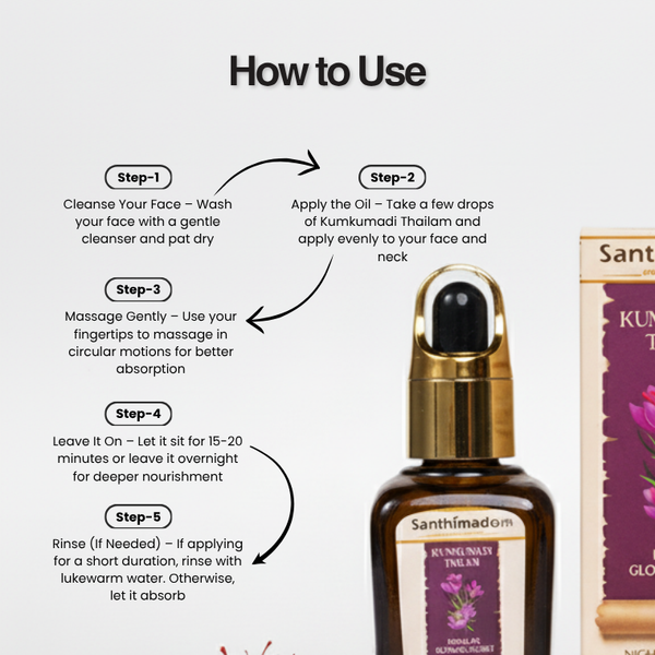 Experience the miraculous glow of Kumkumadi Thailam, Kerala's ancient Ayurvedic beauty secret for radiant and youthful skin. Infused with pure saffron (Kumkuma) and a blend of precious herbs, this luxurious glow face oil deeply nourishes, enhances skin brightness, and helps...