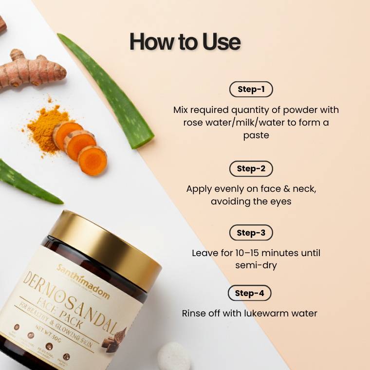 Take the required quantity of Dermosandal Face pack and mix it with curd, milk, or papaya juice to make a paste. Then apply it to the face. Leave it on for 20 to 30 minutes. Wash it off with normal water.